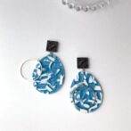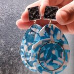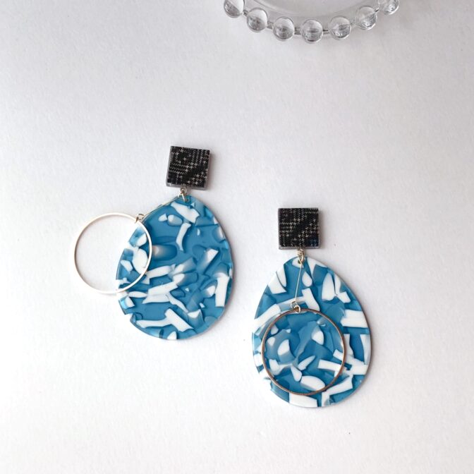 大島紬をレジンで封入し、卵型のマーブルプラパーツを装飾しました。