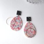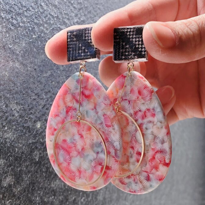 大島紬をレジンで封入し、卵型のマーブルプラパーツを装飾しました。